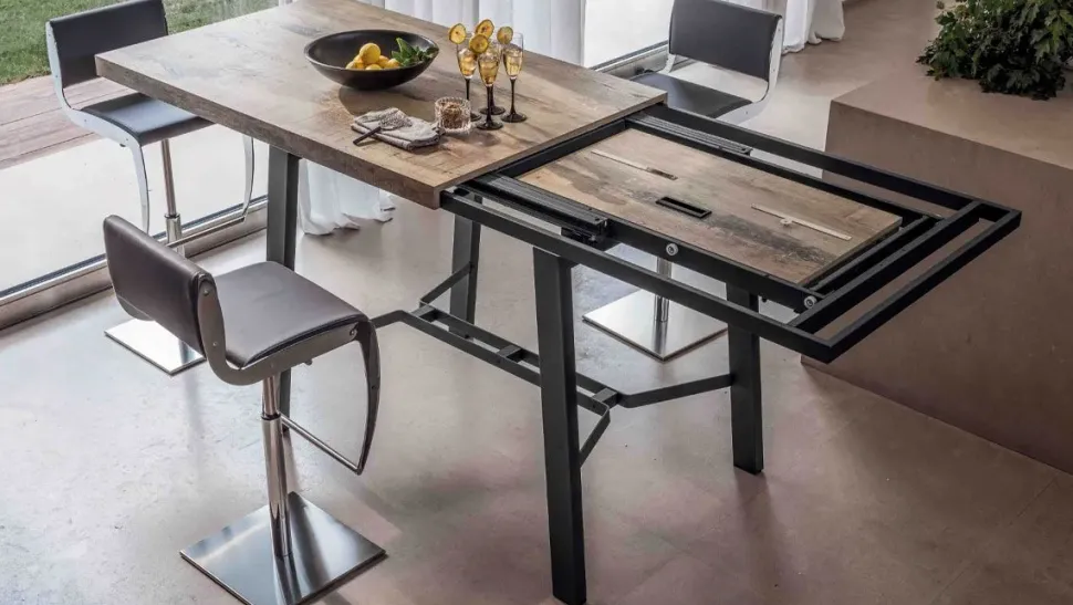Tavolo alto da pranzo / penisola, struttura allungabile in metallo, meccanismo telescopico, piano in nobilitato. Apertura sincronizzata con prolunga interna a libro da 80 cm.