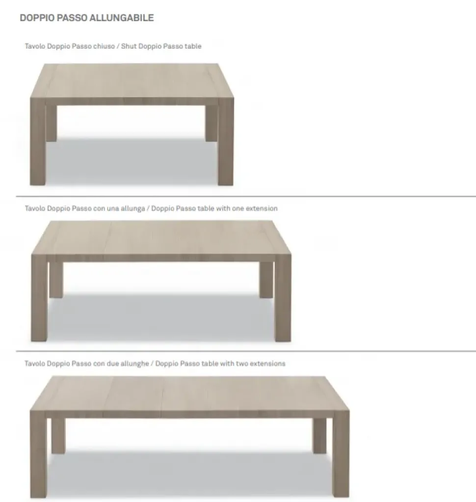 - Tipologia allungabili: Il tavolo Doppio passo è dotato di un meccanismo allungabile che consente di ampliare la superficie di appoggio. Questa caratteristica lo rende versatile e adatto a diverse esigenze.