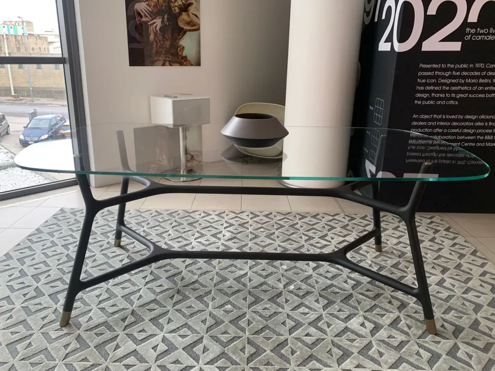 Tavolo in legno di frassino nero con piano in vetro e particolari in ottone.