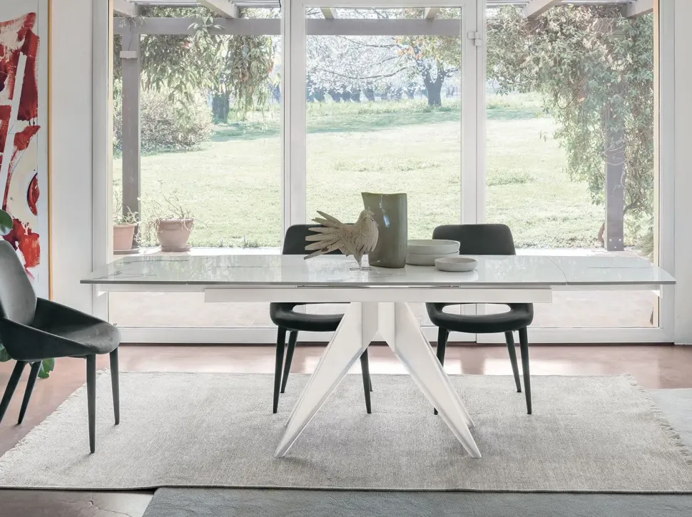 Tavolo allungabile con basamento in metallo.