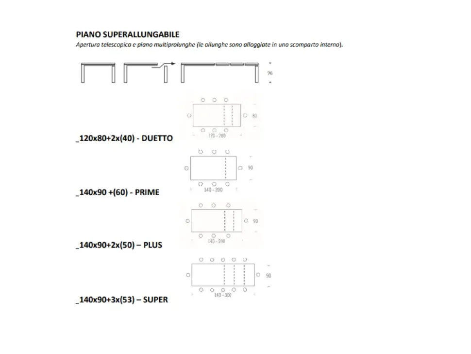 Tavolo Zenith T91 con gambe in metallo, di cui due dotate di ruote, disponibile con piano in vetro, vetroceramica keramic, impiallacciato frassino spazzolato, melaminico. Il telaio super allungabile telescopico si allunga consentendo l’inserimento manuale e progressivo di allunghe ad incastro.