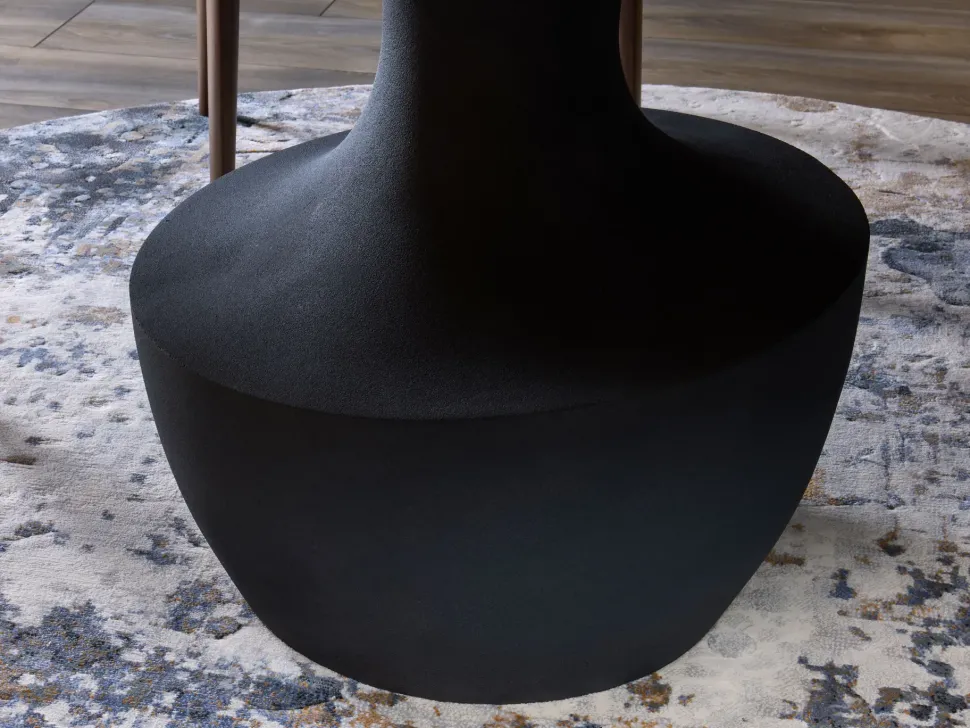 tavolo rotondo con scultorea base centrale in quarzo resinato effetto pietra, a forma di vaso greco