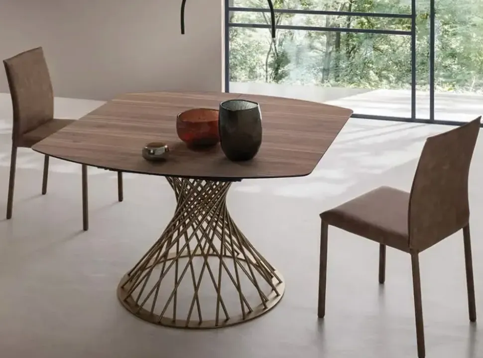 FRANZ è il tavolo fisso o allungabile dal design moderno che si distingue dal basamento in filo di metallo intrecciato.
