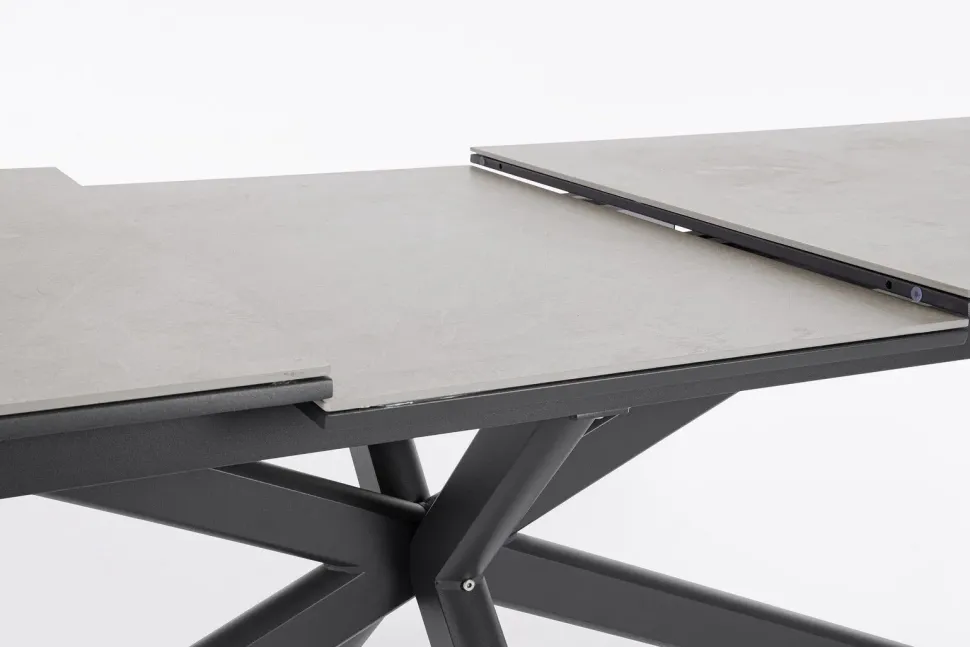 STRUTTURA IN ALLUMINIO VERNICIATA A POLVERE (POLIESTERE). PIANO IN PIETRA SINTERIZZATA (PIETRA NATURALE LAVORATA AD ELEVATE TEMPERATURE)(SPESSORE 11MM) ALLUNGABILI E CON PROLUNGA AUTOMATICA. VITERIA IN ACCIAIO INOSSIDABILE. PIEDINI REGOLABILI. GAMBE DA ASSEMBLARE.