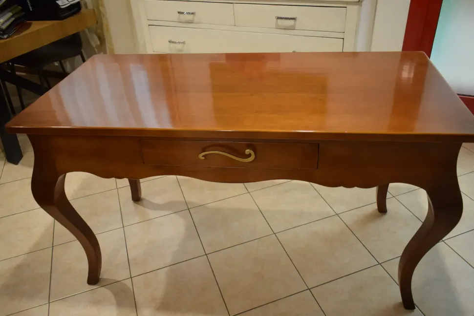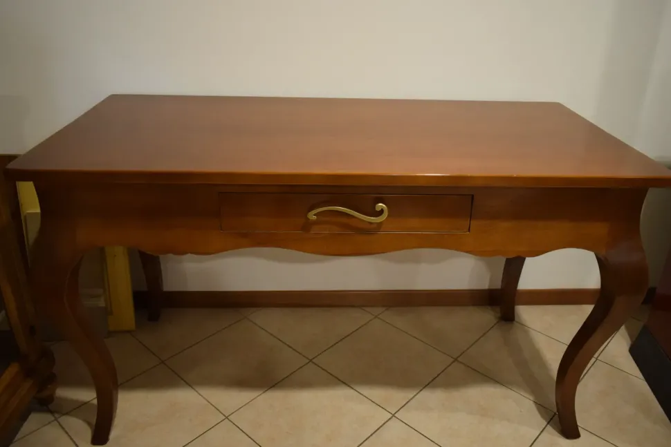La scrivania in legno stile classico, intramontabile nel tempo, di grande arredo, un mobile artigianale costruito da sapienti falegnami veneti. Le dimensioni della scrivania è 140 x 80 con gli angoli arrotondati smussati, anche le gambe sono curve belle rotonde verso l’esterno, una forma originale, nella parte centrale un cassetto in legno, con la maniglietta in acciaio per aprirlo comodamente. La nostra offerta è di Euro 400, 00 con la consegna compresa nel prezzo, in tutta Italia. Per maggiori informazioni e dettagli inviateci info 340 0557150