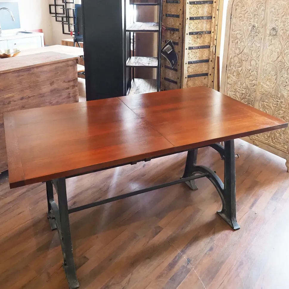 bellissimo ed unico tavolo industrial con basamento in ferro pesante con meccanismo a manovella allungabilequesto particolare tavoloin legno vero legno colore noce tulipie con prolunga centrale e meccanismo a manovella che fa allargare le due parti del tavolo per inserimnato al centro della prolunga molto bello anche il meccanismo ancopra artigianale dellla manovella che ricord ai tavolo del fine ottocento