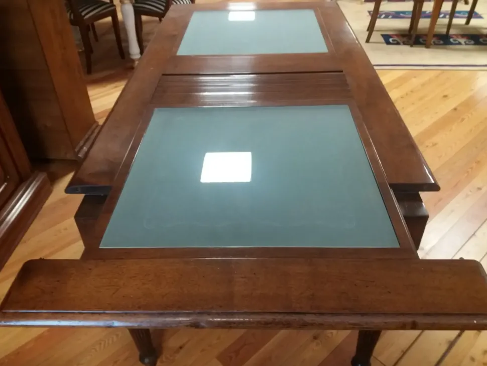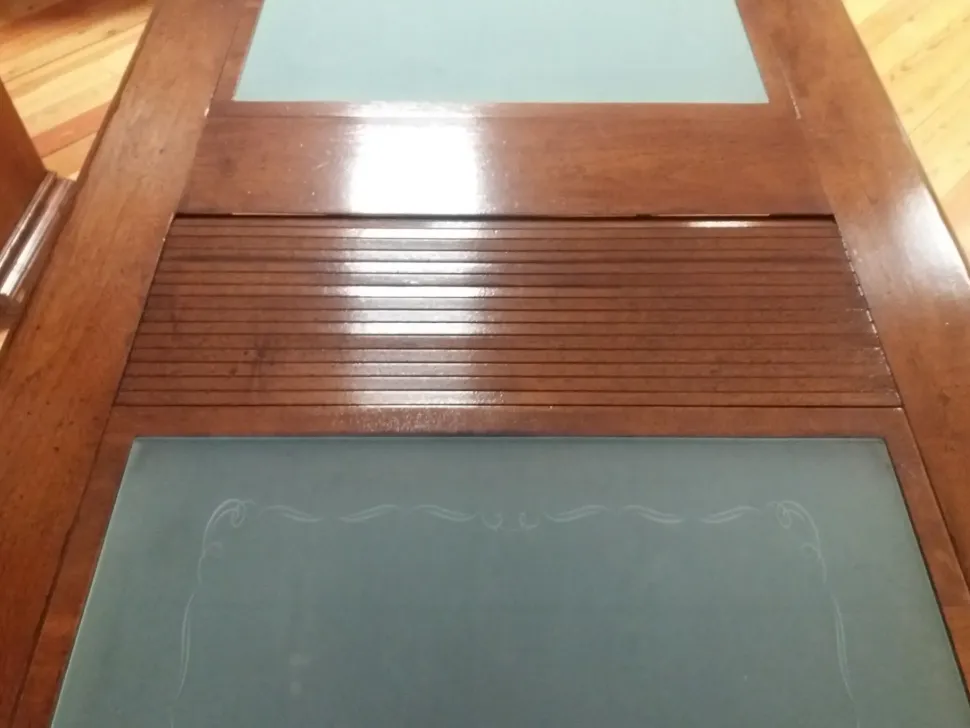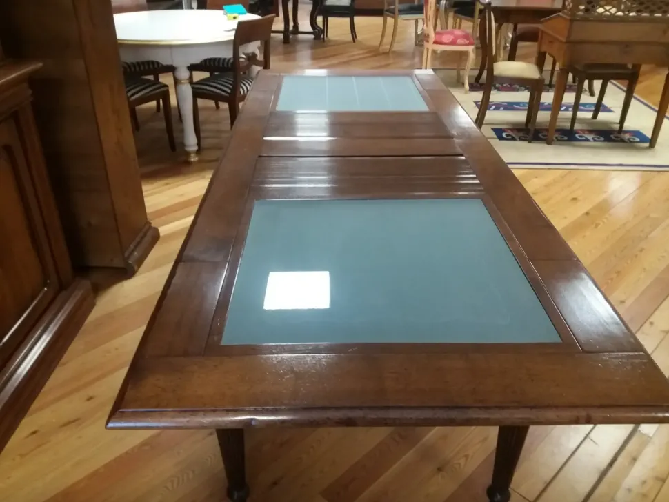 Tavolo Rettangolare in noce con inserti in vetro satinato e decorato, dotato di sistema innovativo di apertura con 2 serrandine scorrevoli a scomparsa (vedi foto).