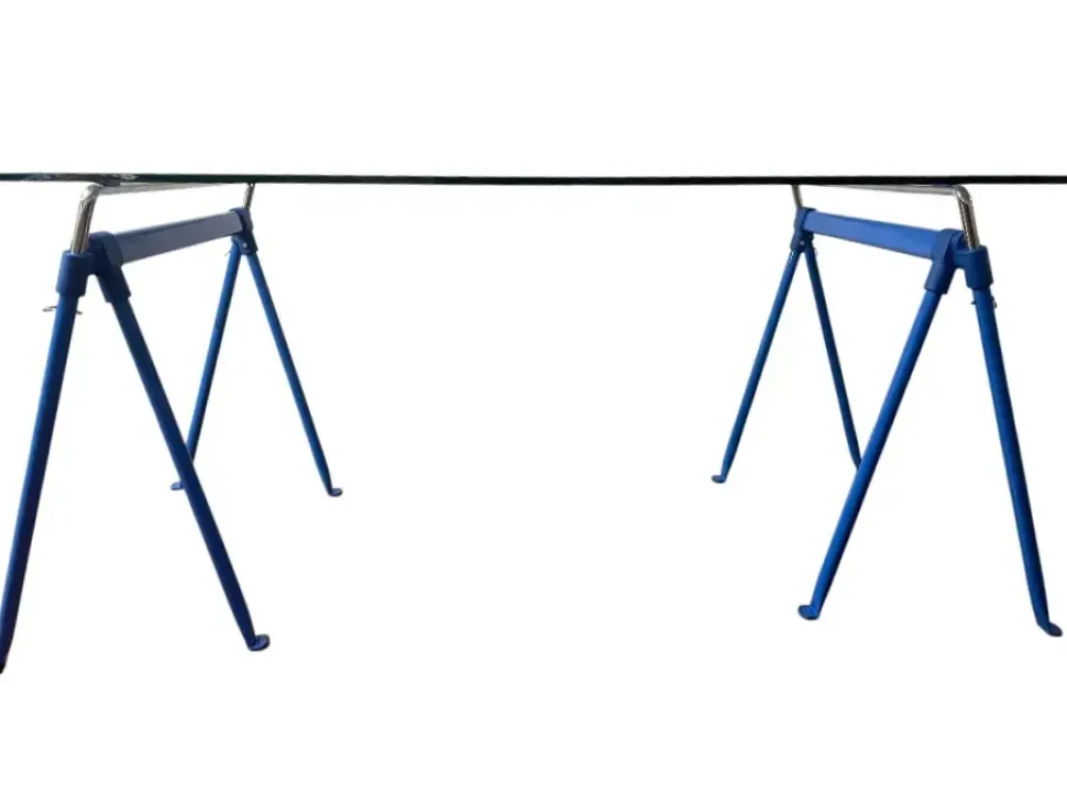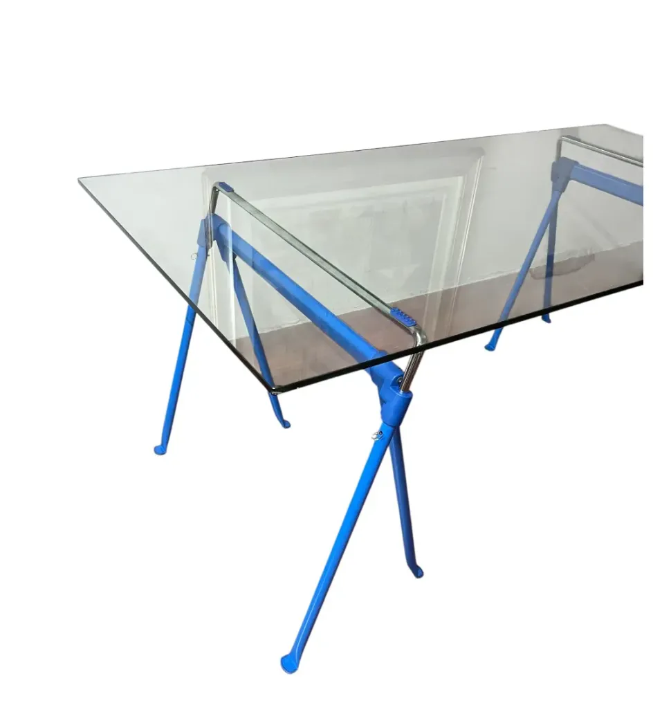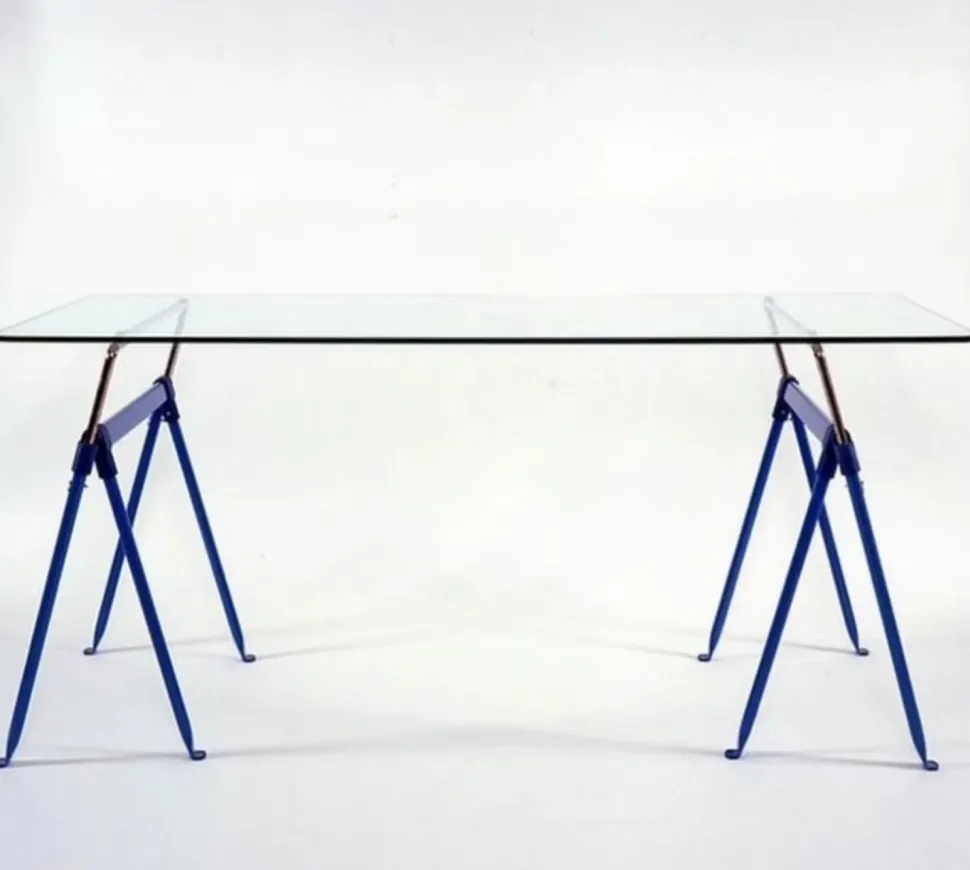 Enzo MARI (1932-2020): Tavolo “Ypsilon” con piano rettangolare in vetro e base a cavalletto. Edizione Magis. Anni ’80. Altezza regolabile. Piano in vetro: 180 x 90 cm. spessore 10mm