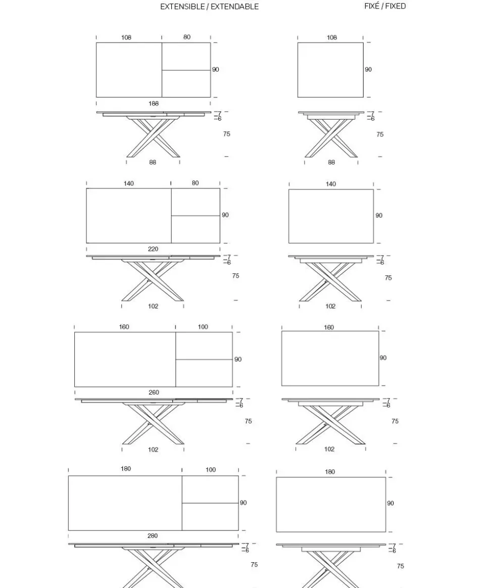 Tavolo da pranzo, struttura allungabile in metallo, meccanismo telescopico, piano in ceramica o in nobilitato, prolunga interna a libro.