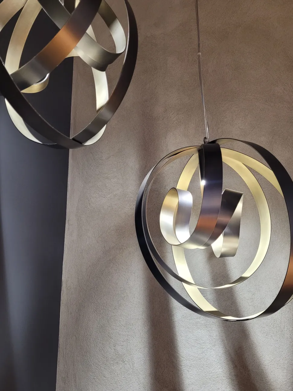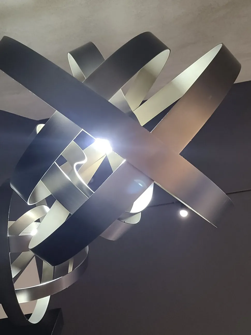 Un paralume leggero e fluido in apparenza, ma solido e stabile, realizzato in acciaio curvato a formare un nastro chiuso in una sfera immaginaria.