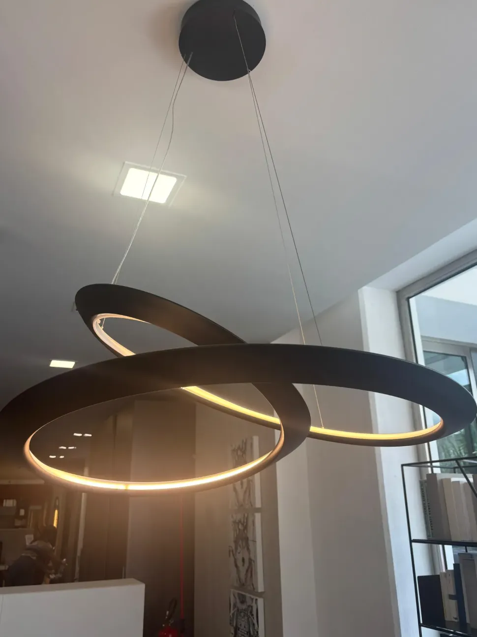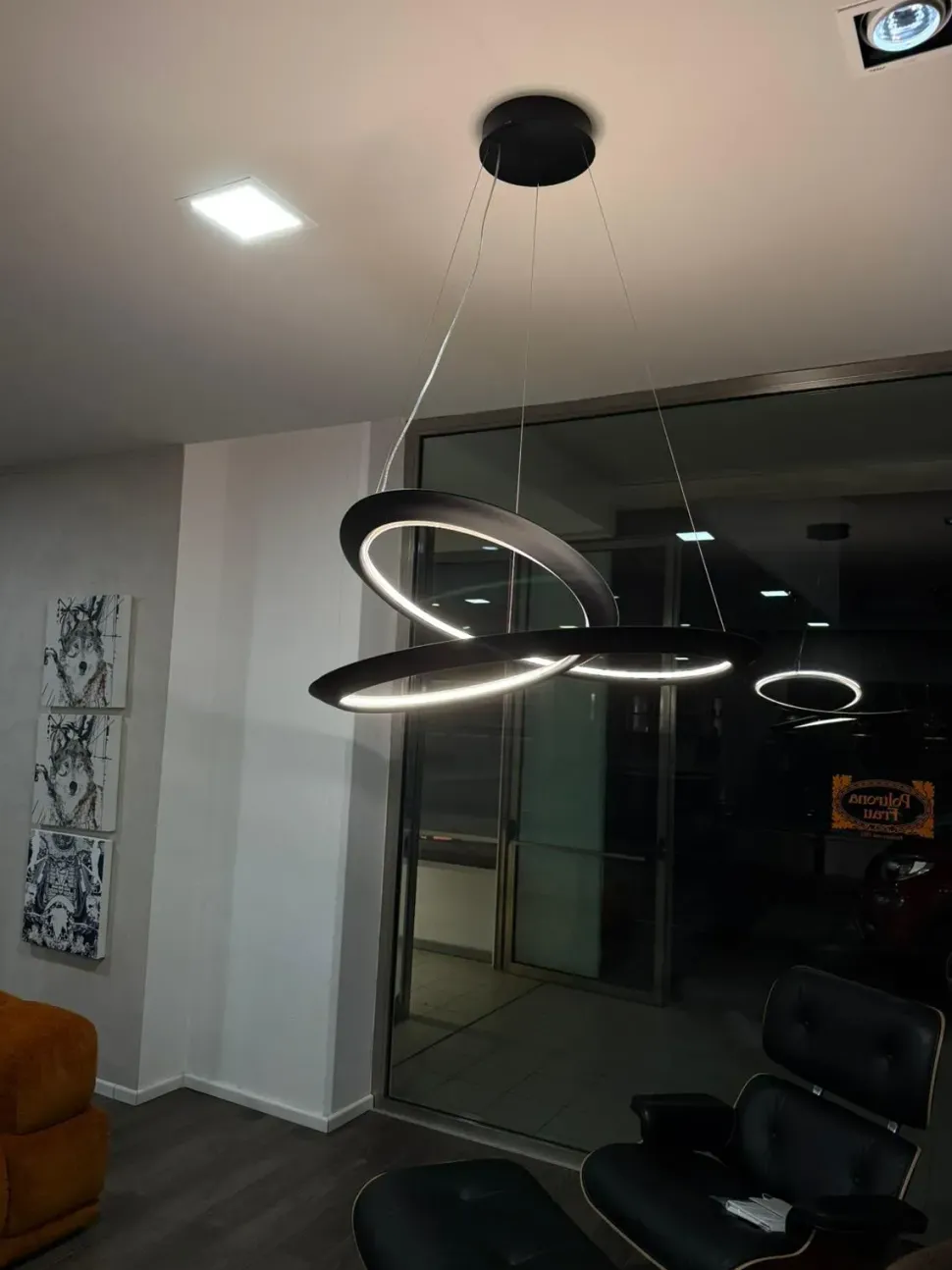 La lampada a sospensione Kepler di Nemo: struttura in alluminio estruso, linea continua ispirata al nastro di Möbius, LED integrato e finiture nero opaco. Offerta outlet esclusiva.