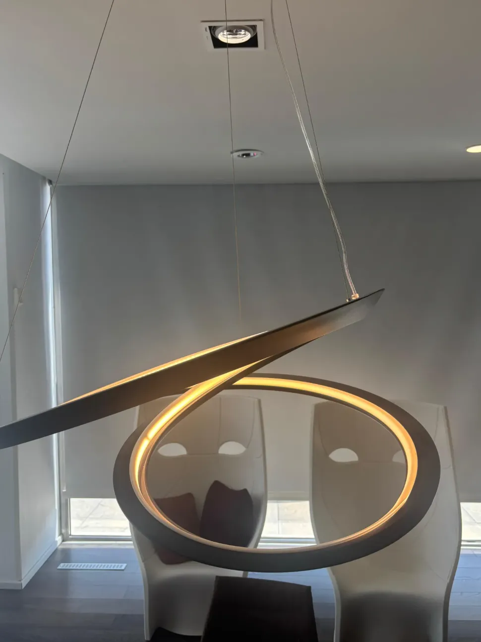 Progettata dal designer Arihiro Miyake, la sua forma è ispirata al nastro di Möbius e realizzata tramite estrusione tridimensionale di alluminio, generando un effetto di continuità luminosa e scultorea.
