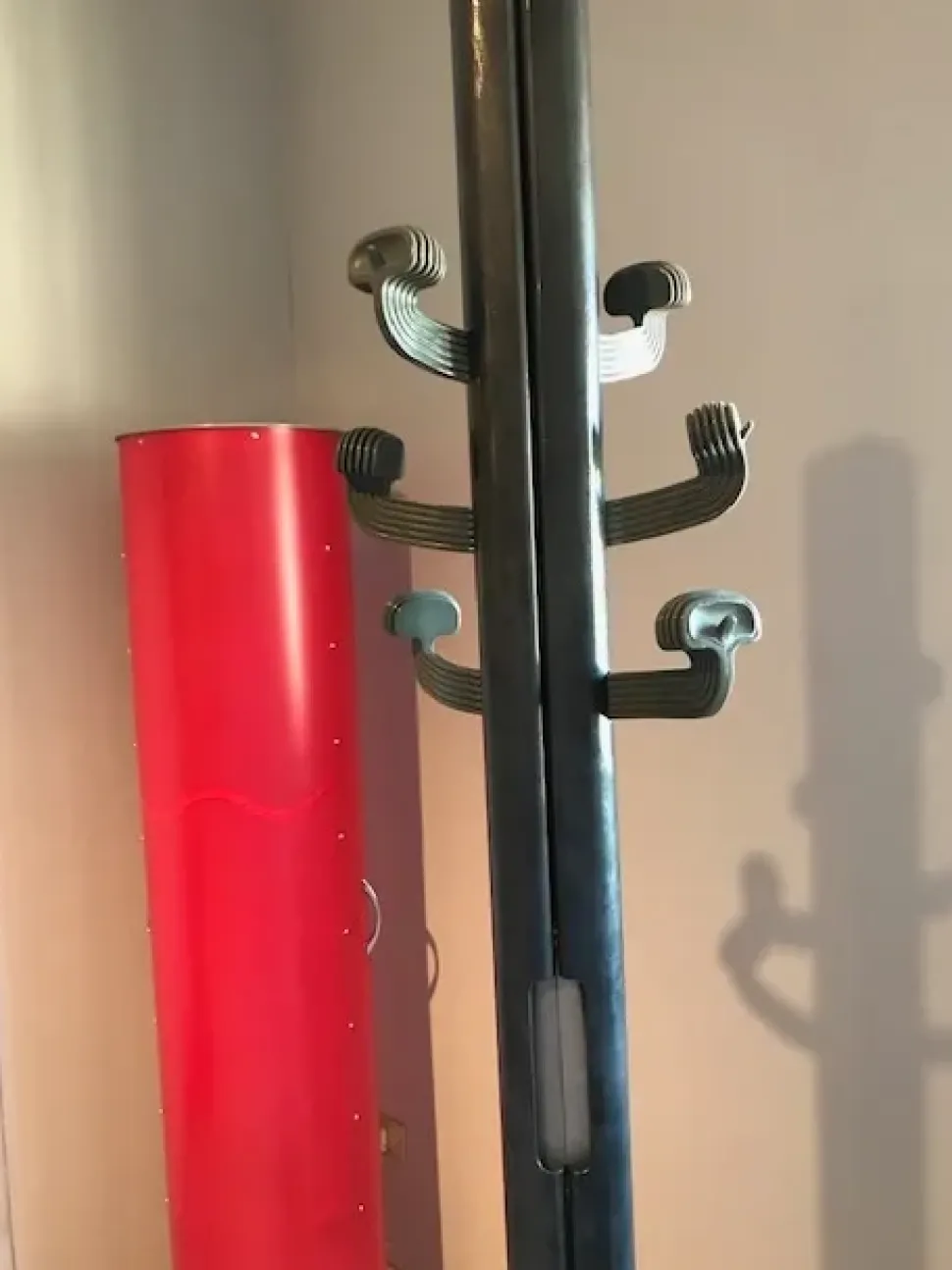 Appendiabiti-scala. Fuoriuscendo dalla sua base si trasforma in una scala a compasso con tre montanti – dotata di solidi gradini in alluminio pressofuso – che all’occorrenza e una volta riposizionata nella propria base, ritorna ad essere appendiabiti. Dimensioni cm. Ø40xh196