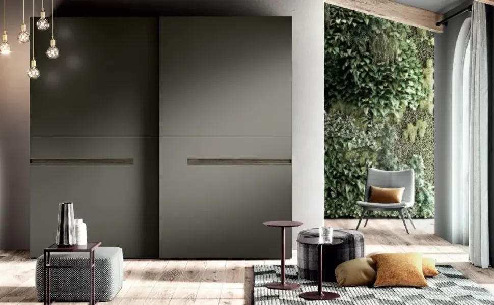 Armadio dal design minimal con particolare maniglia incassata in legno massello, Finitura laccato opaco pietra.