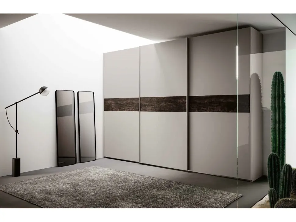 Armadio composto da tre ante L.120 cm mod. Folk in finitura grigio seta con inserto in legno bruciato (disponibili 7 diversi tipi di inserto).