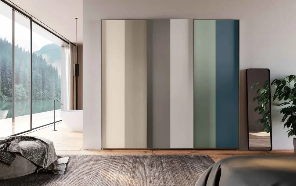 Armadio molto capiente, a tre ante scorrevoli caratterizzate dalla personalizzazione delle finiture e dal maniglione verticale colorato.