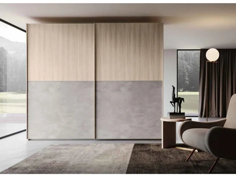 Armadio composto da due ante L.135 cm in doppia finitura: olmo natura e ardesia cemento. La nuova finitura effetto spatolato offre la possibilità di abbinamento sia con essenze che con colorati. La venatura del legno rende l’ambiente più caldo ed accogliente.