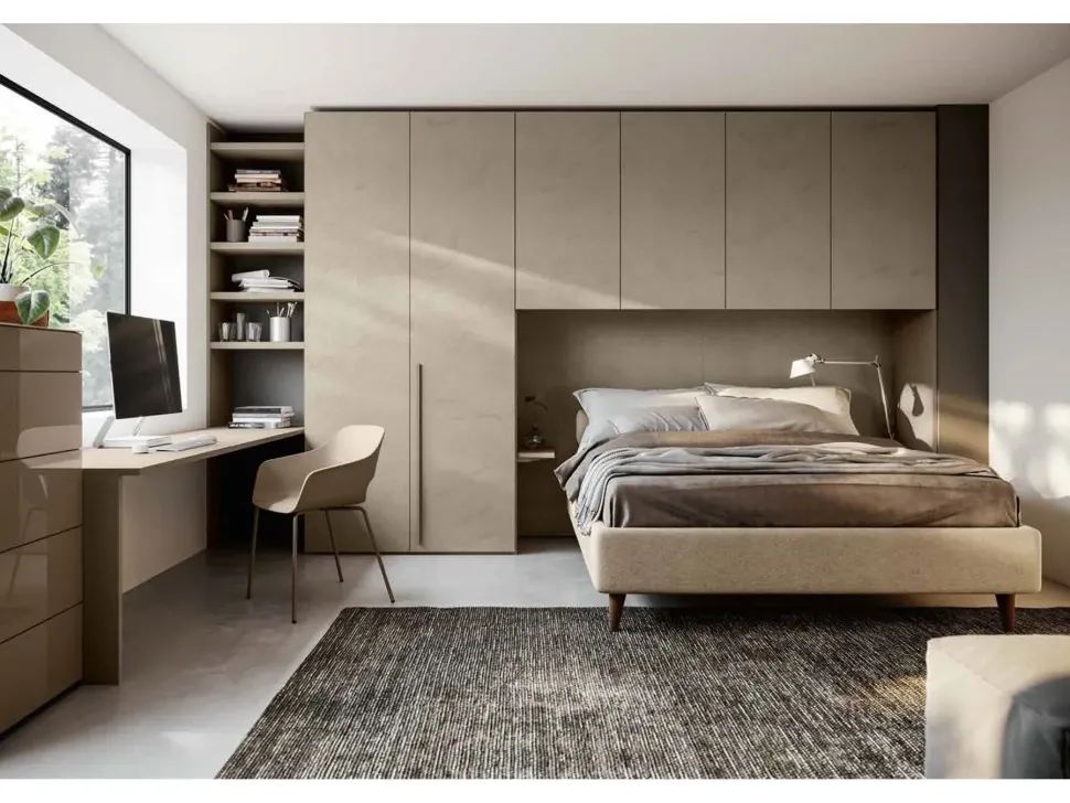Armadio composto da modulo L. 120 cm a doppia anta battente con maniglia mod. Vola a sinistra e ponte a quattro ante con coppia di mensole sottoponte a destra. Completa la composizione una piana scrittoio L. 200 cm.