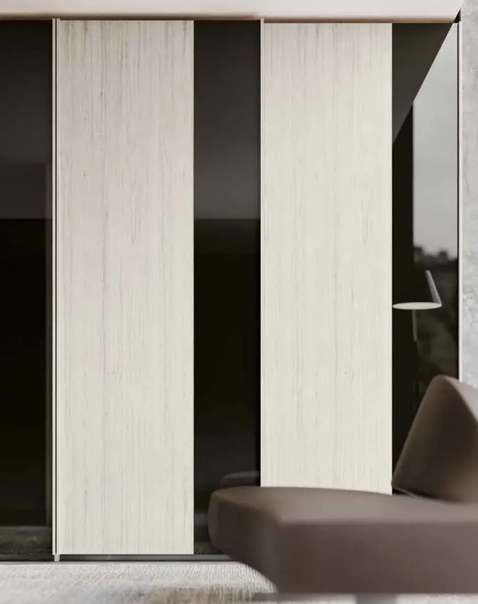 Armadio è composto da quattro ante L.90 cm in finitura bianco altea. Novità di questa linea è l’anta da 90cm con inserto specchio fumé da 30, che arricchisce l’armadio di riflessi profondi, rendendo suggestivo ogni ambiente. L’anta specchio è disponibile nelle finiture: fumé, bronzo e neutro, e nelle finiture vetro: marmo chiaro e scuro.
