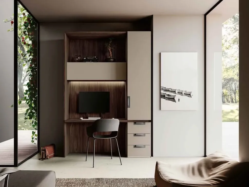 Armadio funzionale composto da un’anta con sottostanti n°3 cassetti (L. 45 cm) e boiserie con scrittoio e sopra pensile a vasistas (L.120 cm).