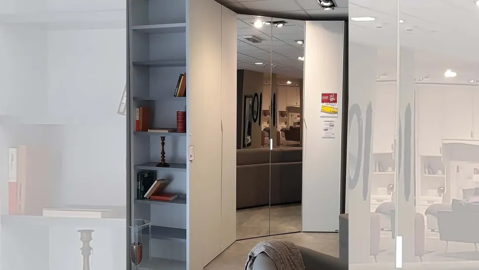 Armadio ad angolo composto da 6 ante battenti, di cui 2 ante centrali con specchio e libreria terminale.