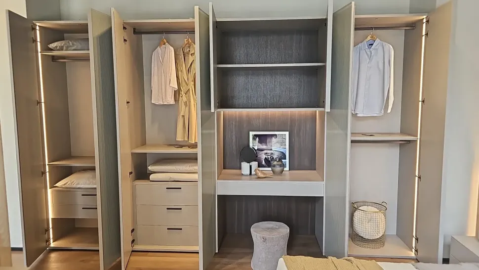 Per valorizzare il tuo spazio in una moltitudine di possibilità estetiche, scegli la soluzione che meglio si adatta alle volumetrie di cui disponi: il modello qui presente va oltre 301 cm in larghezza e saprà certamente assicurarti ampio spazio per i tuoi abiti e gioielli. Nonostante ciò, contatta i nostri store manager del settore arredamento se vuoi sondare la possibilità di apportare delle modifiche realizzabili su misura al modello base.