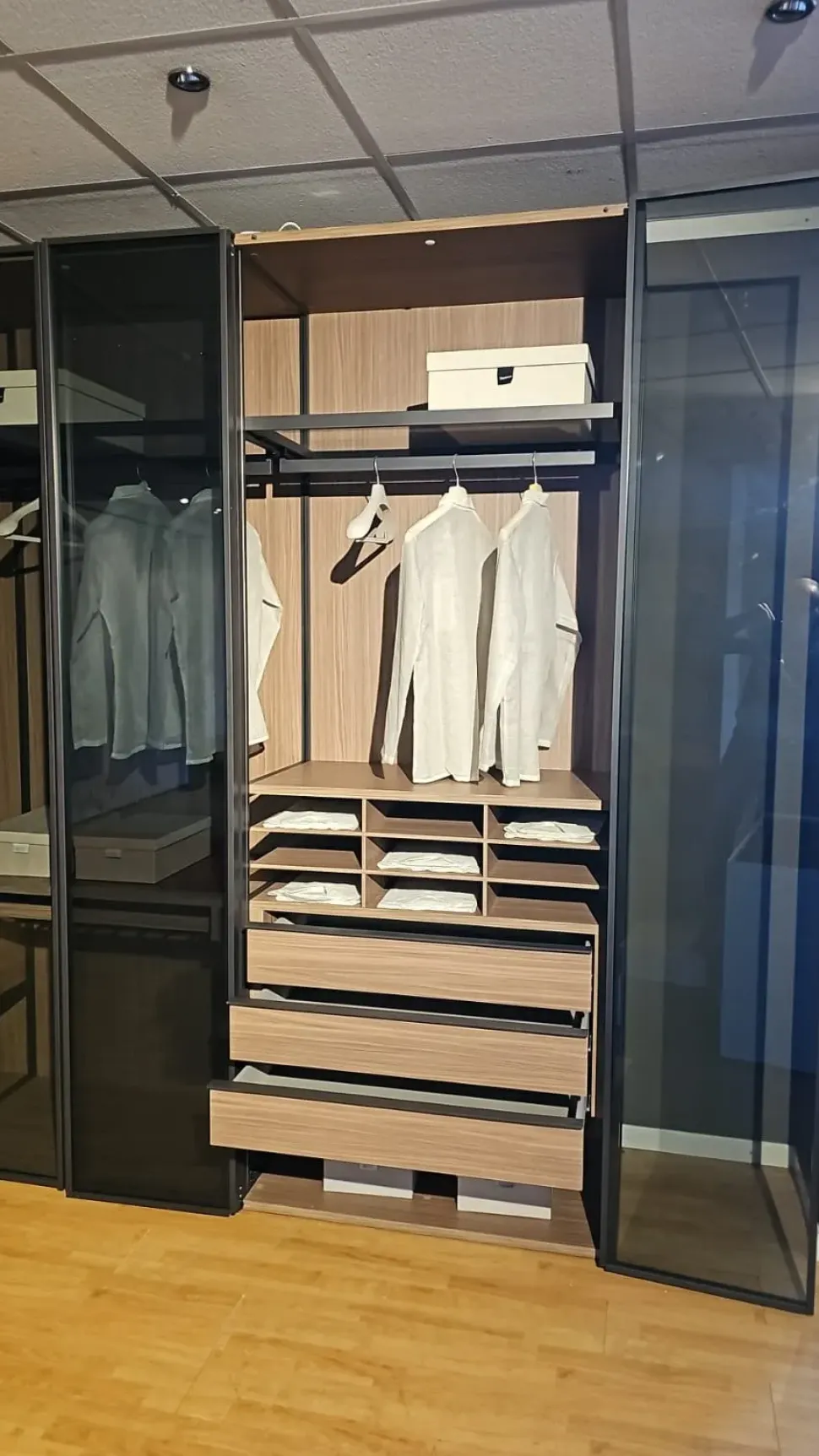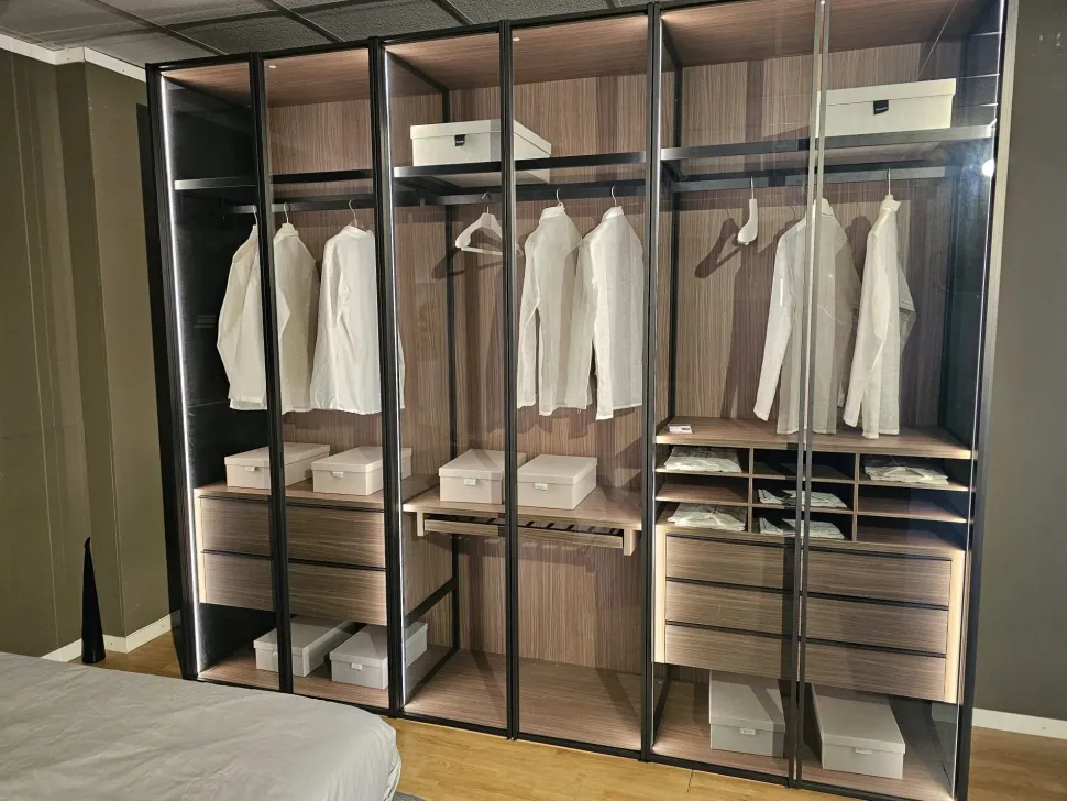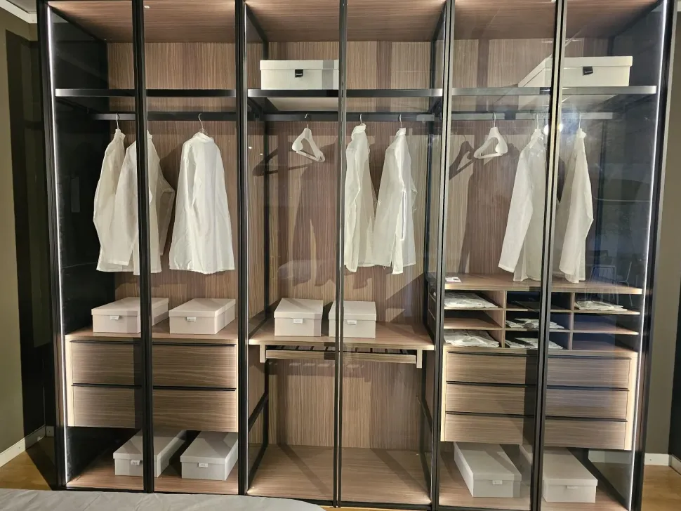 Armadio battente ADOK mod. Crystal con ante in vetro trasparente fumè, interno in finitura caramel. Ante con profilo in metallo finitura ghisa. L’armadio è completo di: