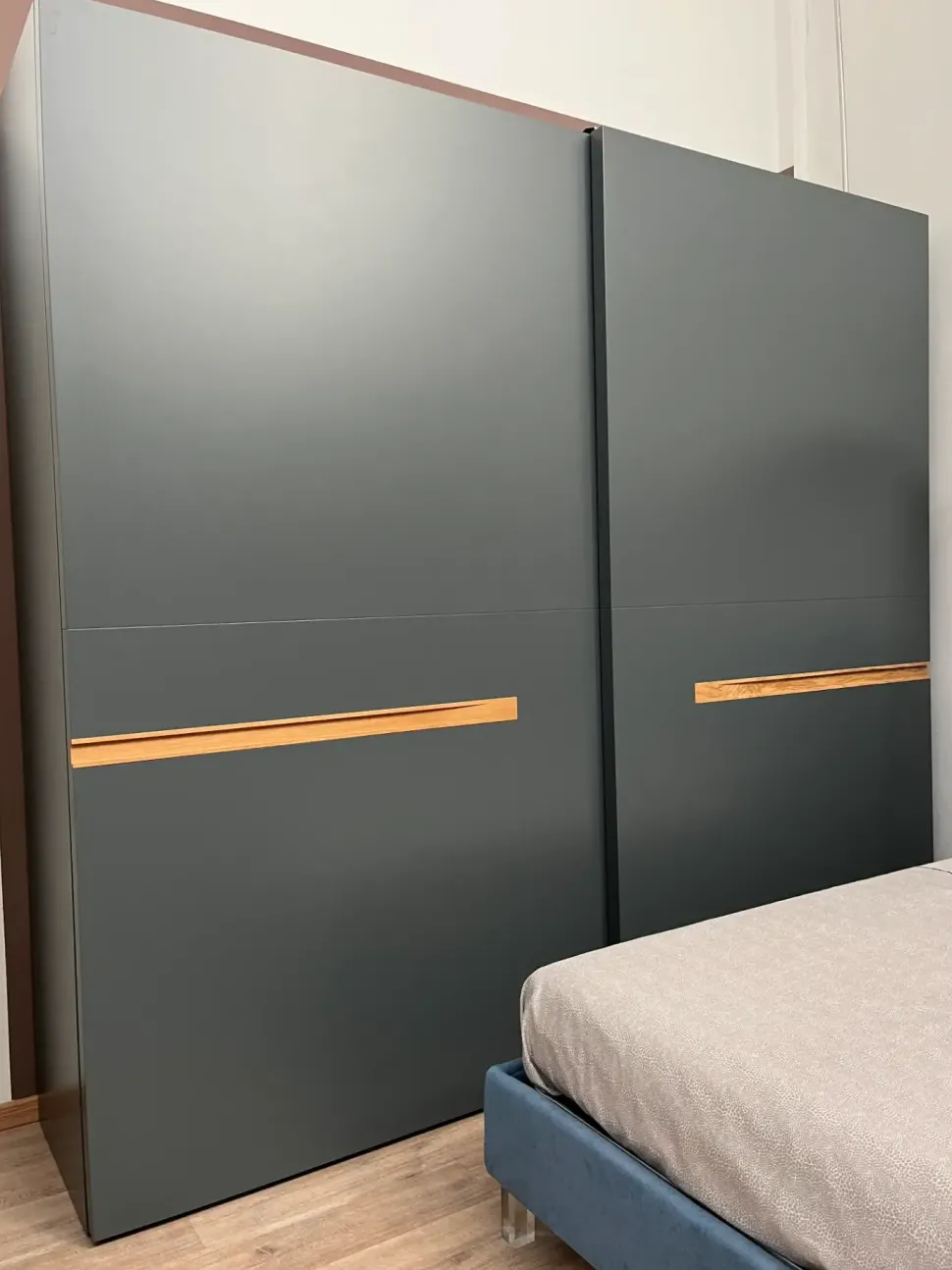 Armadio con maniglie ad incasso in rovere naturale, ante e fianchi di finitura laccate Ardesia. misure: L 278,5 x P 71,5 x H 257 cm.