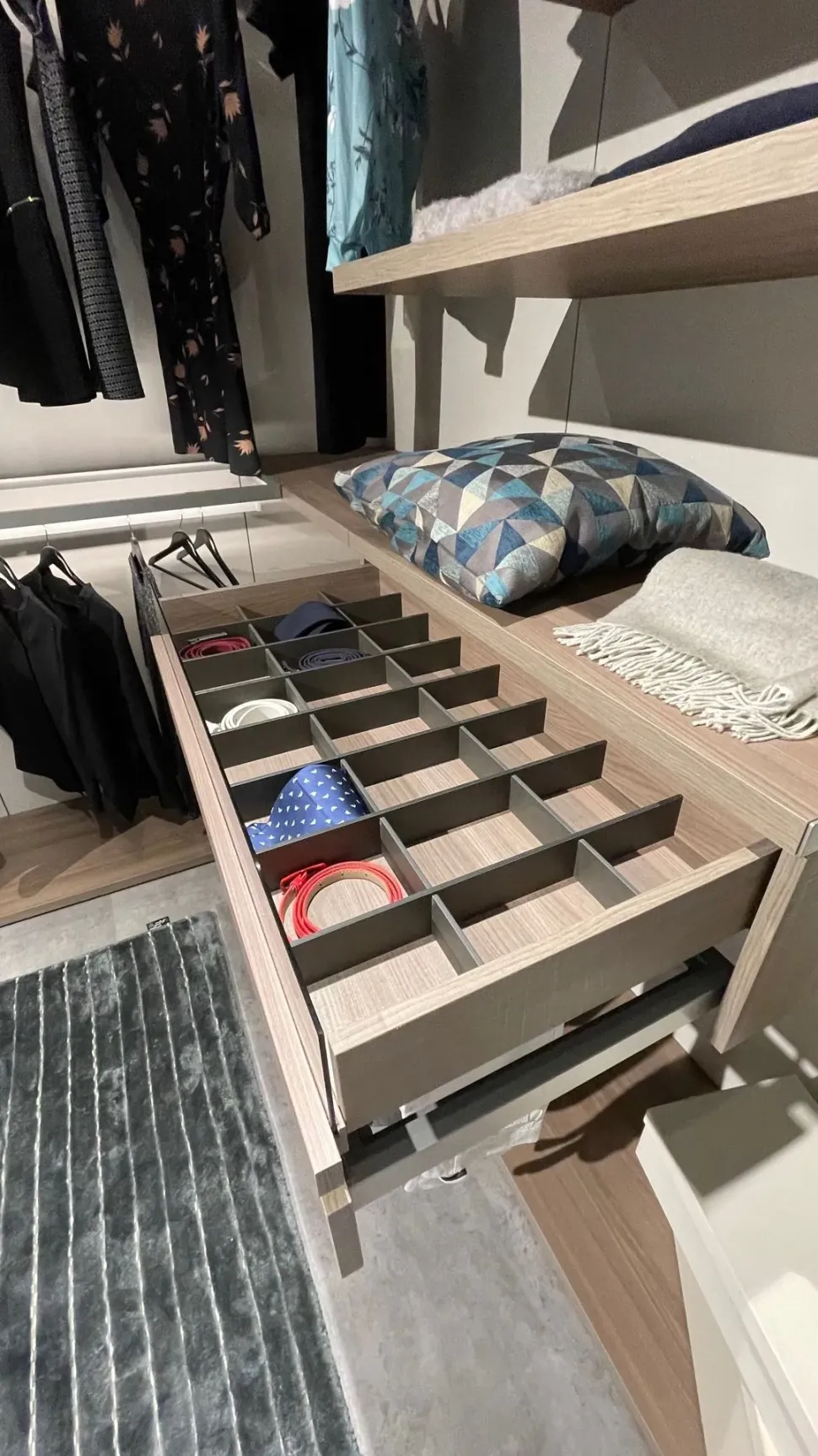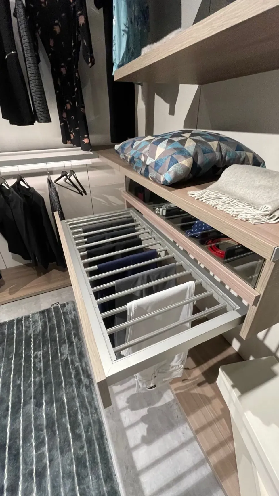 I led illuminano la cebine e 2 ripiani trasparenti la rendono unica.La cabina armadio è comprensiva di portacravatte ed accessori estraibile,il porta pantaloni estraibile ,un porta oggetti sulla cassettiera ed uno specchio molto funzionale.