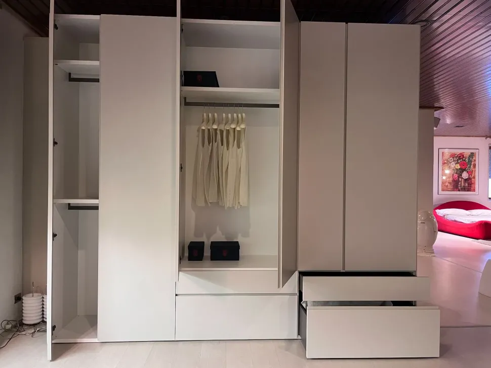 ARMADIO mod. GRAFIK ante battenti + nr° 2 cassetti e nr° 2 cestoni esterni. L 302,5 H 263,6cm. Finitura laccato opaco RUGIADA, interno lamè BIANCO NEVE