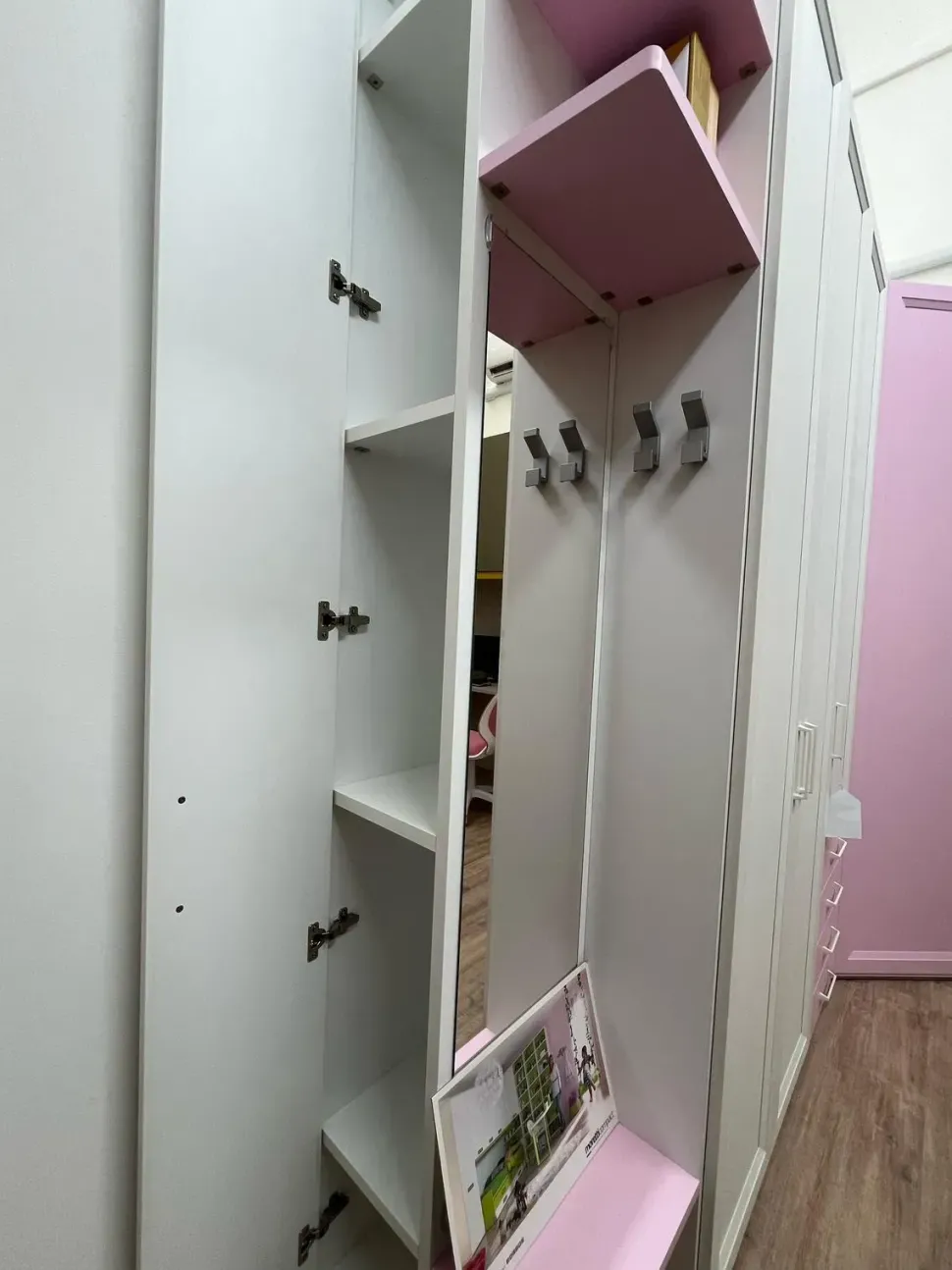 Cabina armadio, modulo armadio con cassettiera interna e terminale con anta laterale con ripiani all’interno.