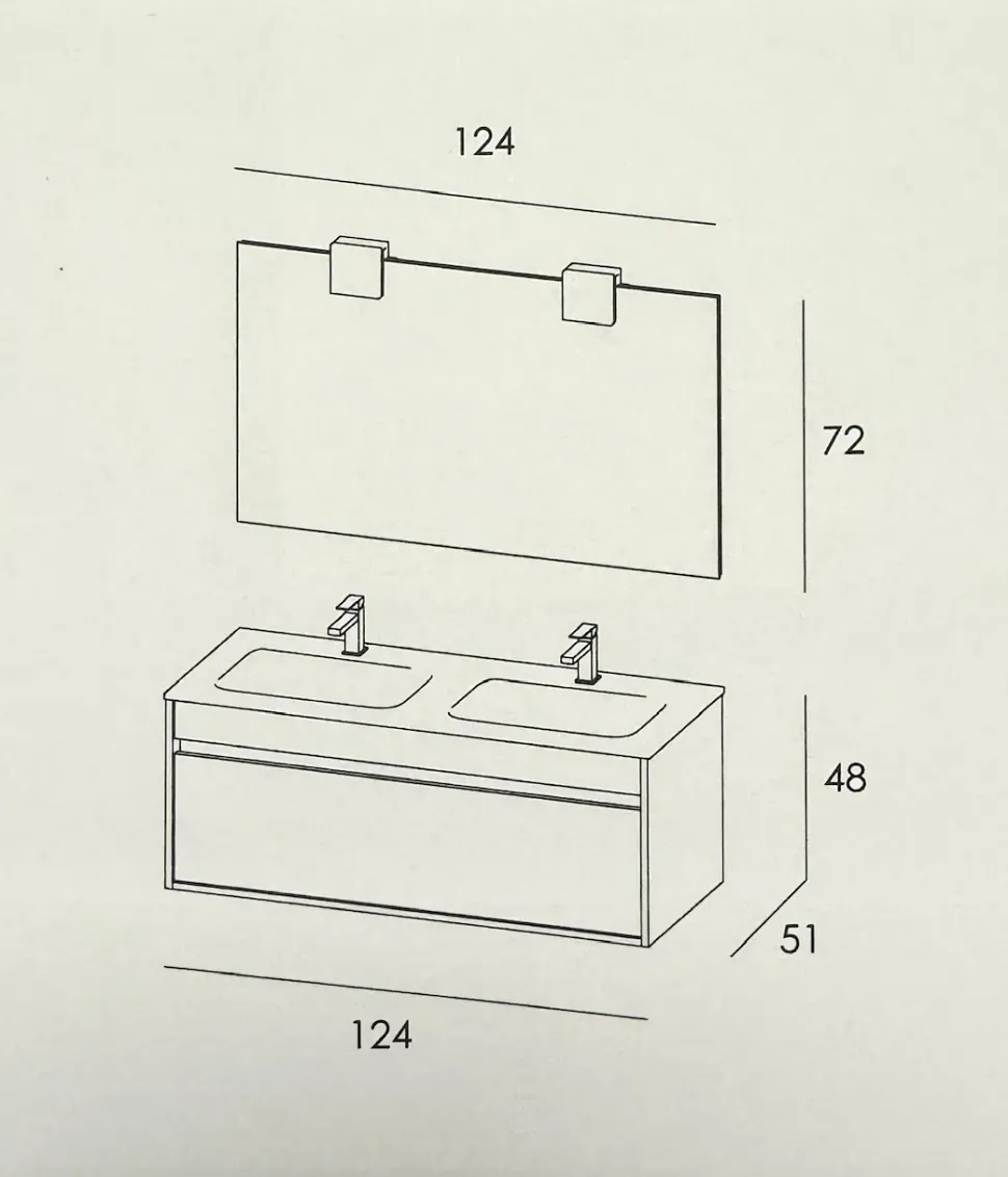 Questa meravigliosa composizione include il Mobile bagno Duetto Next 13 con finiture in color legno Noce Fumè e gola color Ebano L.124 x 51p.x 48h. con doppio lavabo Mak Mat e il grande specchio mod.Fil L.124 x h.72 cm. con doppia luce LED mod.Qube.