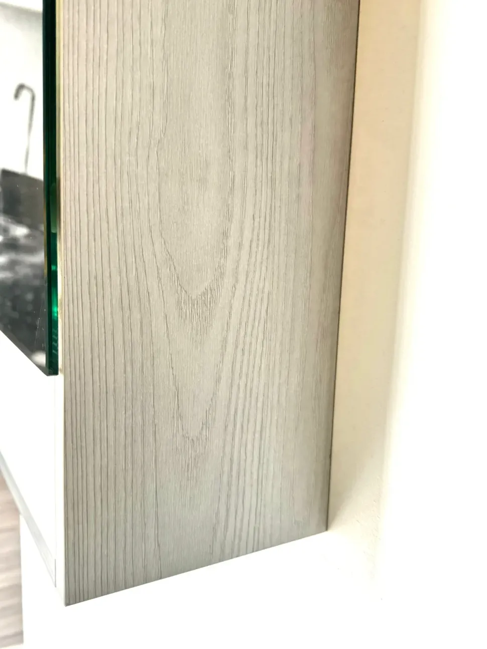 Struttura con finitura Quercia bianca, ripiani interni in vetro. Doppia presa elettrica all’interno.