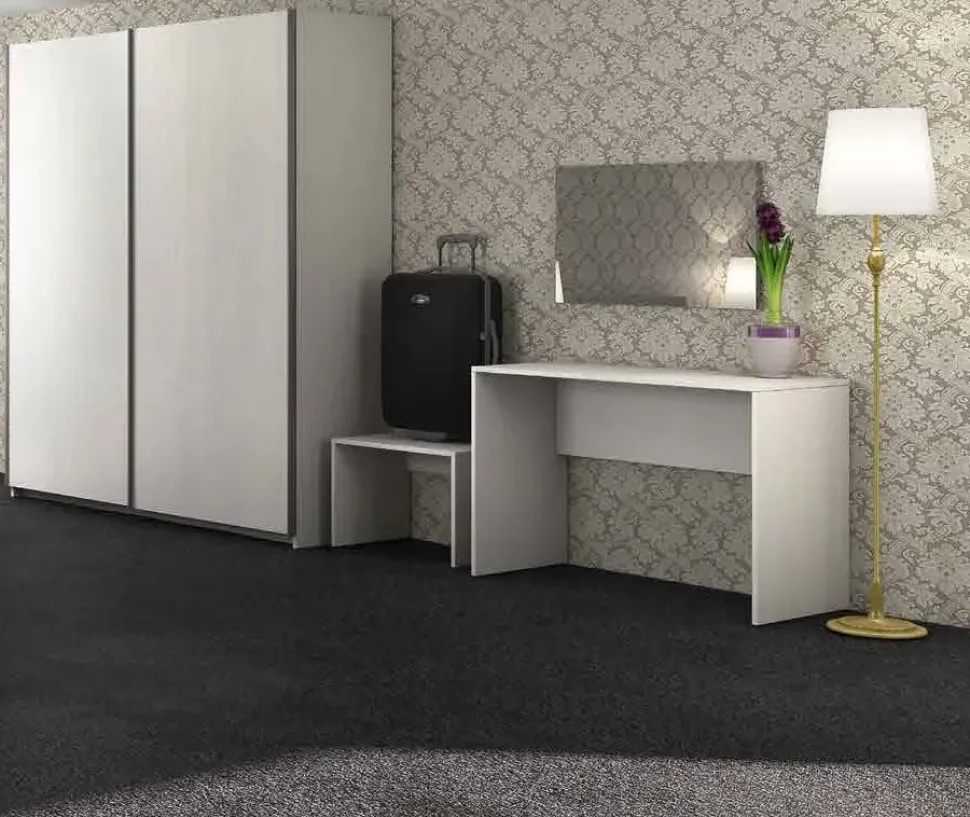 - Tra i materiali di qualità che l’azienda ha scelto per la sua linea di arredamenti per la zona del riposo, non può mancare certamente il laminato con cui questo modello Camera completa contract è stato costruito, materiale appropriato per rispondere alle richieste di praticità ed estetica individuali; design unico, resistenza nel tempo e solidità strutturale sono garantiti in questa proposta di qualità elevata, in quanto è costruita seguendo una certa coerenza stilistica.