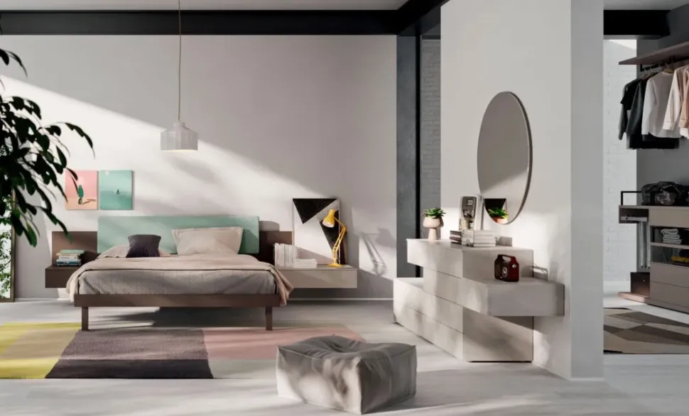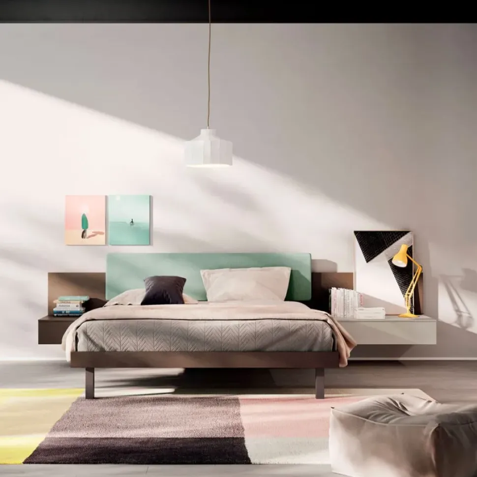 Componibilità e flessibilità sono le caratteristiche principali di questa soluzione, sintesi di uno spazio dal look moderno ed essenziale, adatto ad ogni personalità. Camera matrimoniale composta da Boiserie letto Diska 160x200cm in dekor Bronzo con pannello imbottito in tessuto Favignana S205, Ring alto Alfa in dekor Bronzo con piede quadrato. Gruppo componibile Bilo in dekor Bronzo e Canapa. Composizione su ordinazione con finiture dei materiali personalizzabili, disponibile in 40 giorni lavorativi. La nostra offerta è di 2.700,00, rete letto e materasso esclusi. Consegna nazionale compresa nel prezzo, in tutta Italia.
