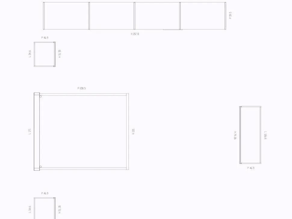 – n?1 cabina lineare con ripiani in alluminio/vetro incluse cassettiere interne (L.402,5 x P. 66,4 x 257,8 cm)