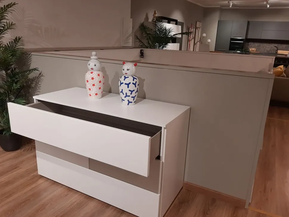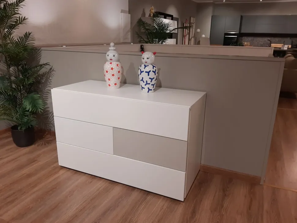 Gruppo letto composto da comò mod. Jean in finitura laccato opaco bianco neve da L 128 cm H 79 cm, P 55 CM e n. 2 comodini mod. Jean in medesima finitura e inserto grigio dorian da L 52 cm H 47 cm P 46 cm.