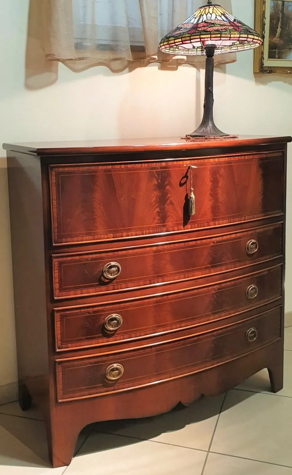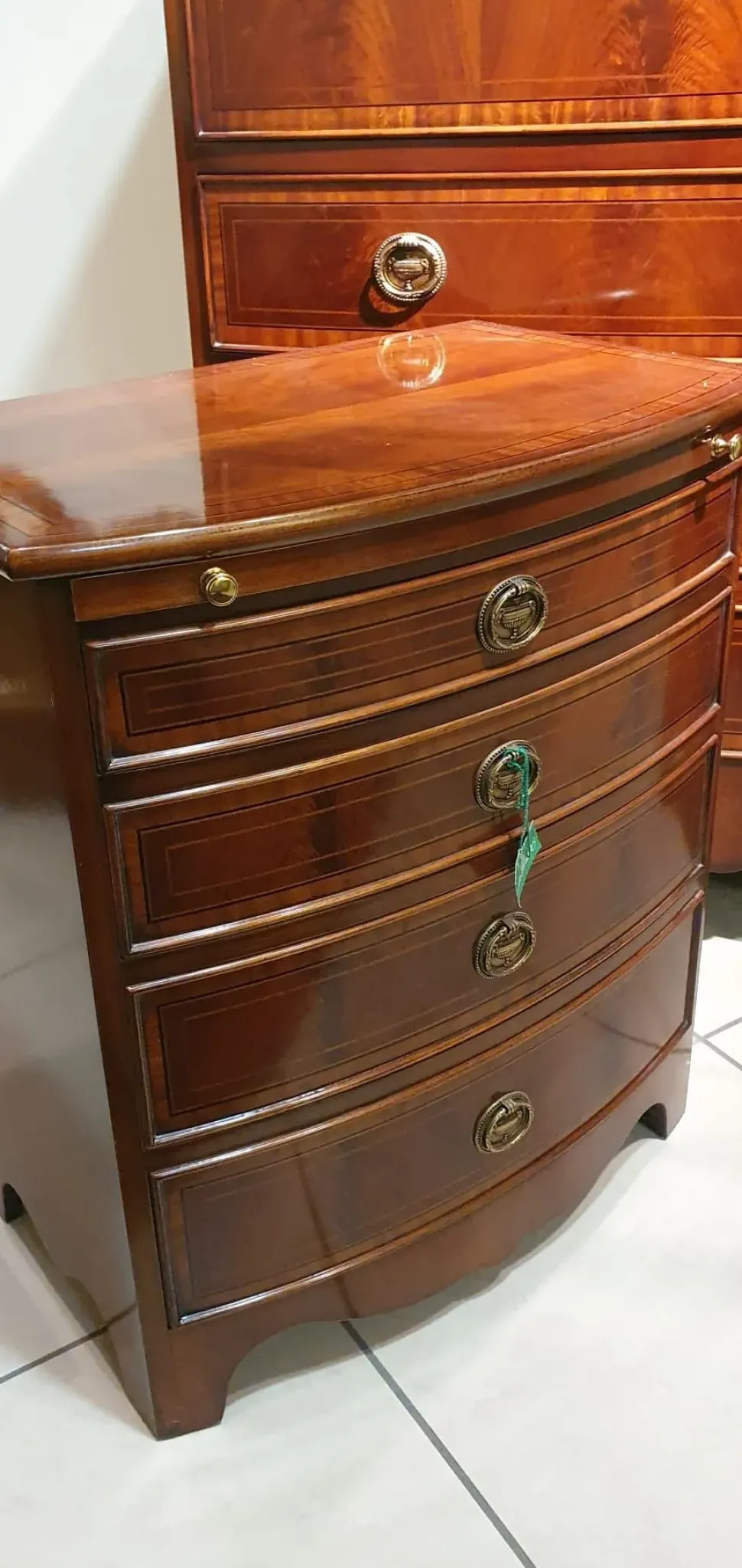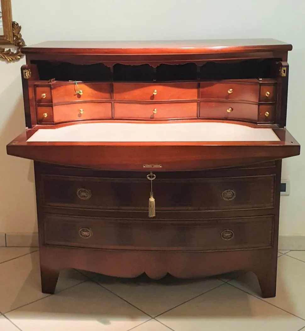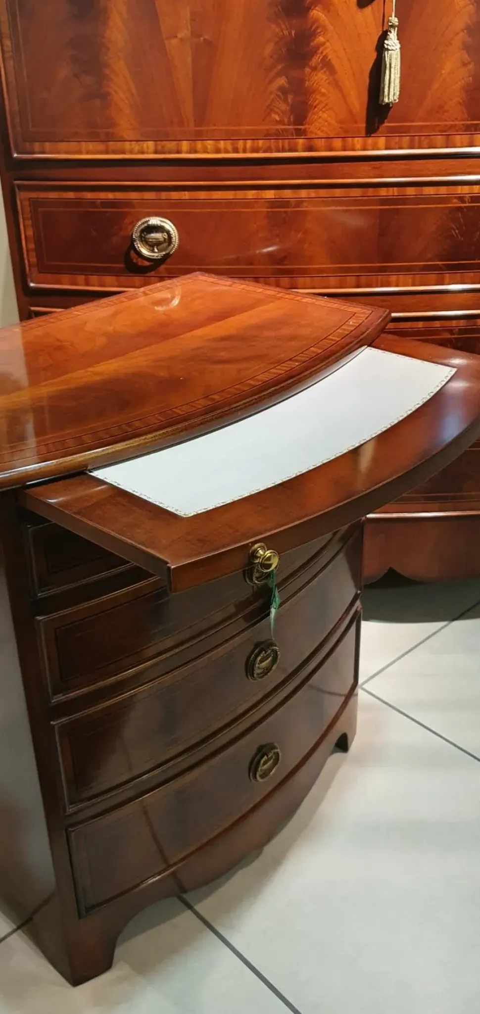 Prestigioso gruppo firmato Medea di 2 comodini e comò con secretaire a forma bombata in piuma di noce con intarsi in radica. I comodini presentano 4 cassetti di differenti altezze e in alto è presente un tiretto estraibile rivestito in pelle bianca. Le dimensioni sono L. 55 x p. 35 x h. 62. Il comò ha tre cassettoni grandi e in alto presenta un’anta con apertura a ribalta che mostra al suo interno il secretaire con piano rivestito in pelle bianca e 8 cassettini sagomati. Le dimensioni sono l. 107 x p. 53 x h. 110 cm. Consegna esclusa da valutare a seconda della destinazione. Consegniamo in tutta Italia con trasportatore specializzato.