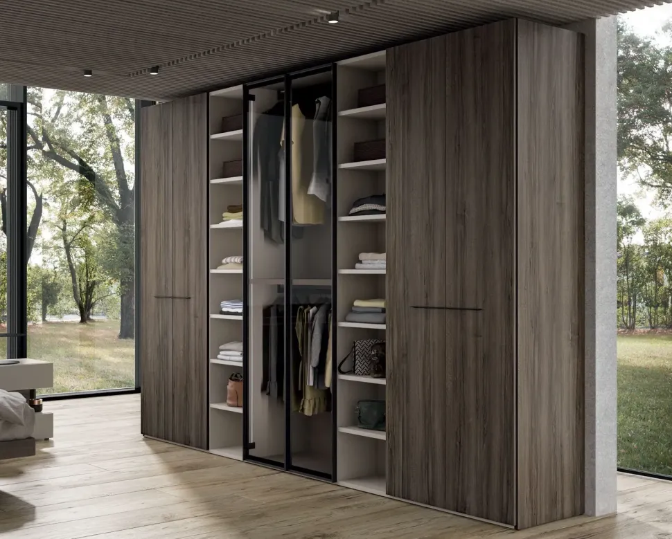 - Armadio a 4 ante in melaminico, 2 antea vetro e 2 librerie Mis. cm L.357.4 – H.258.7 – P.59.3, con interno 3 ripiani e 6 appendiabiti.