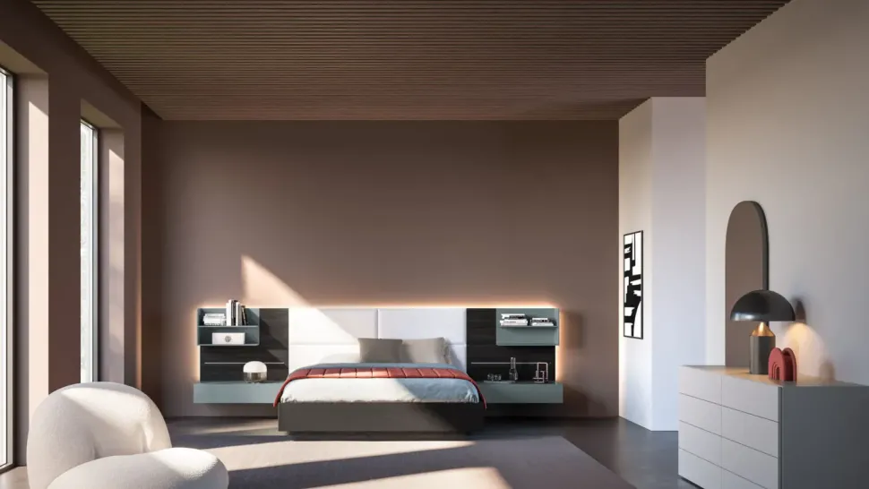 Sistema boiserie letto Giako con pannelli in materico Carbone e pannelli imbottiti in tessuto Brunilde BR10, giroletto Tau in materico Carbone.