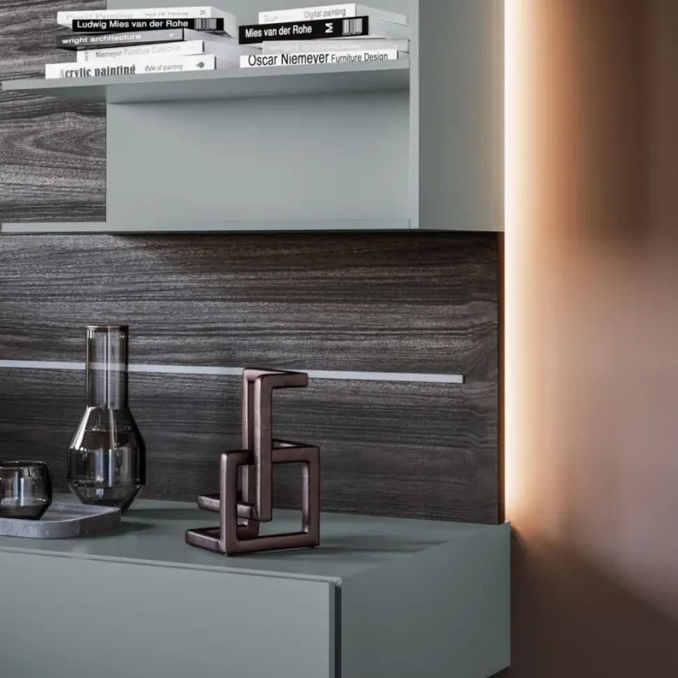 Elementi: Accessori in laccato opaco Nebbia. Como Compongo in laccato opaco Piuma con specchio Soul.