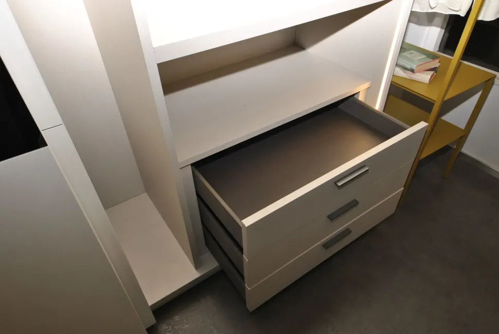 Attrezzatura armadio e optional inclusi: 1 cassettiera 3 cassetti, 4 ripiani legno, tubi appendiabiti e tre illuminazioni verticali led sui fianchi.