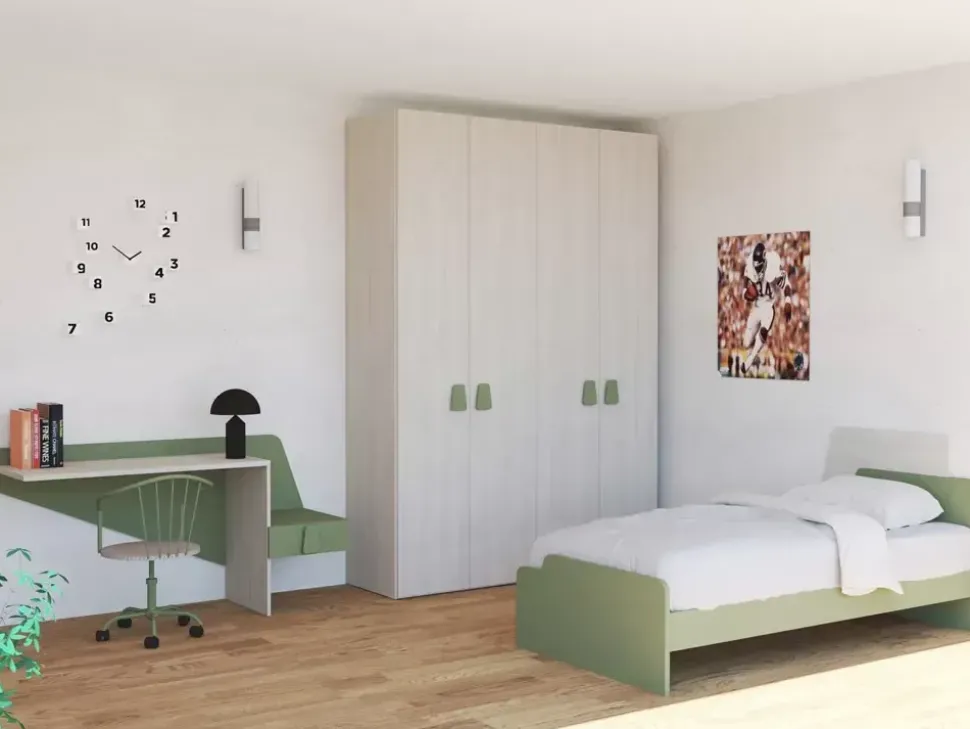 La cameretta è disponibile in due varianti di finiture: Ciliegio Bianco e Verde Oliva, oppure Ciliegio Bianco e Titanio.