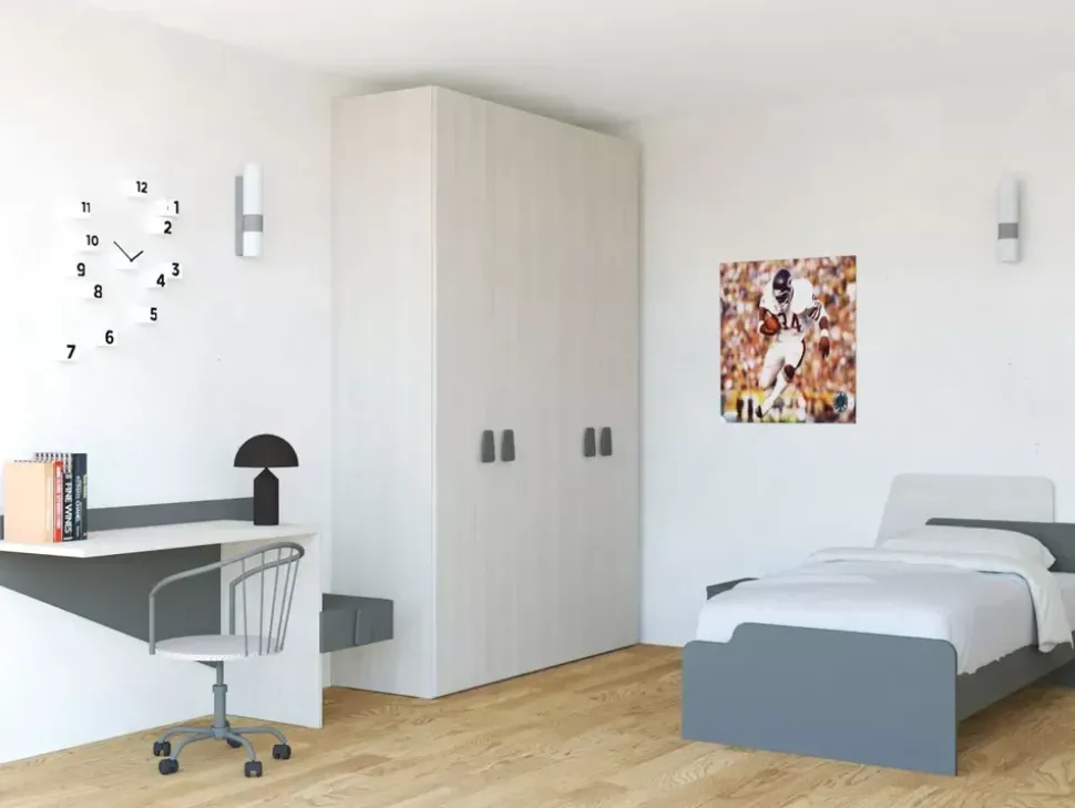 Completano la composizione un comodino a 2 cassetti rallentati e il letto singolo con testata di design per rete da 90×190 cm.