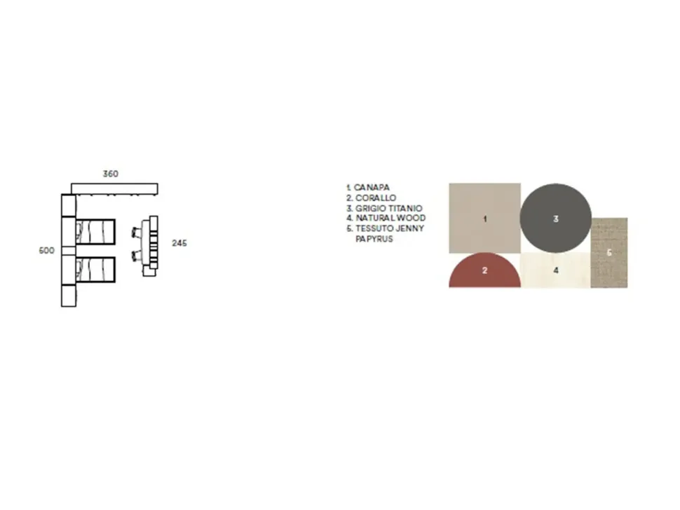 Le finiture sono canapa, corallo, grigio titanio, natural wood e tessuto Jenny effetto papiro , ma c’è la possibilità di personalizzare dimensioni e finiture di tutta la composizione.