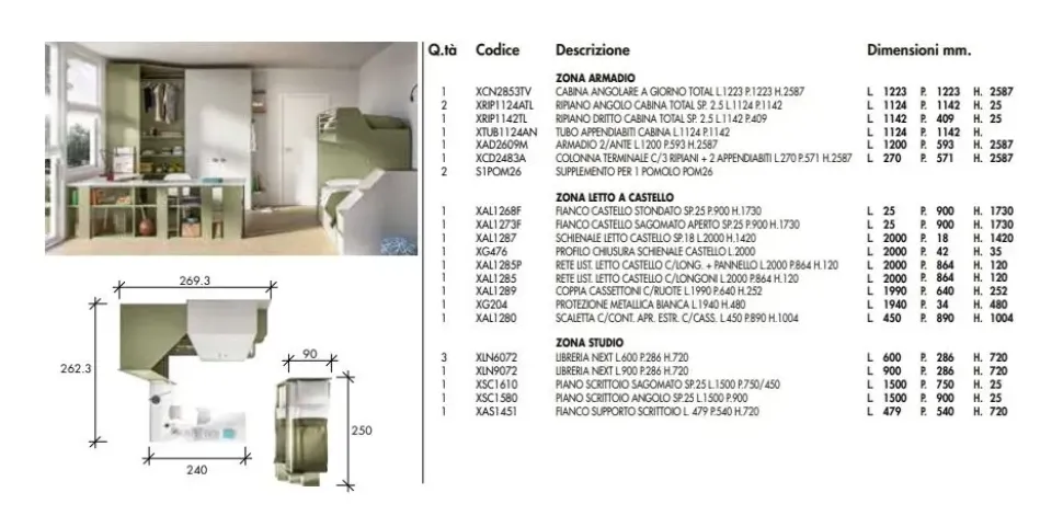 Nel mondo di camerette per la generazione Alpha, la vitalità dei colori, la novità dei materiali e la vibrazione giocosa degli elementi rendono ogni spazio unico ed accogliente. Un ambiente vivace e stimolante, dove il gioco e lo studio si fondono in un’unica esperienza educativa. La composizione dispone di letto a castello con scaletta, li lunghezza totale 250cm, profondità 90cm, altezza 174cm. La scaletta dispone di vani contenitori, la soluzione perfetta che unisce funzionalità, stile e comfort in un unico arredo. In un unico arredo anche il doppio scrittoio, pensato per offrire una funzionalità ottimale. Le due superfici di lavoro permettono di organizzare al meglio lo spazio e di sfruttare al massimo le potezialità dell’arredo. Libreria “Next” integrata. Per concludere troviamo la cabina armadio angolare, lunghezza 270cm, profondità 123cm, altezza 259cm. Armadio con ante battenti, ripiani ed appendiabiti a vista. Rete inclusa. Escluso invece il materasso. Personalizzazione delle finiture senza variazione di prezzo. Consegna compresa nel prezzo, 30-40 giorni lavorativi. L’offerta per questa cameretta è di euro 3800,00. Per maggiori informazioni contattaci via mail o passa a trovarci nel nostro showroom.