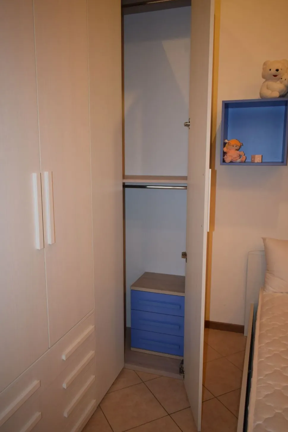 Cameretta Smart con letto singolo a terra versione con il box contenitore rete a doghe compresa misura 80 x 190 cm., armadio due ante battenti con quattro cassetti con maniglie, una comoda cabinetta armadio angolare a due ante, libreria con sei ripiani arrotondati lato sx, pensili cubetti aperti colore cobalto. Questa composizione ha una Larghezza di 102cm lato dx, Larghezza di 225cm, Altezza armadi 260cm. Finiture come da proposta in bianco vento , olmo venato e particolari cobalto Trasporto in tutto il territorio nazionale senza costi aggiuntivi. La nostra offerta è di euro 2000,00. Per maggiori informazioni o preventivi contattaci via mail o passa nel nostro showroom per valutare le nostre proposte.