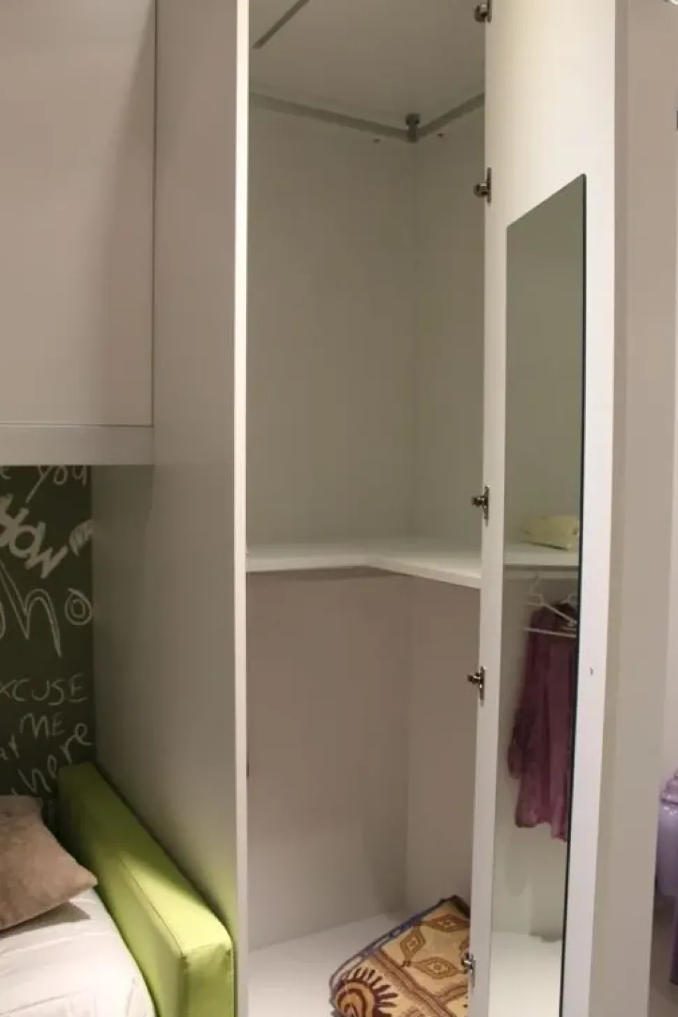 - Una cameretta che si rispetti deve includere un spazioso armadio 2 ante: non solo ti assicurerà di avere sempre disponibile lo spazio di cui hai bisogno per il ricovero di capi di abbigliamento e complementi tessili, ma anche di giochi, libri ed oggettistica assortita; non sarà complicato per i tuoi bambini contenere le proprie cose grazie allo spazio disponibile nell’armadio qui visibile.