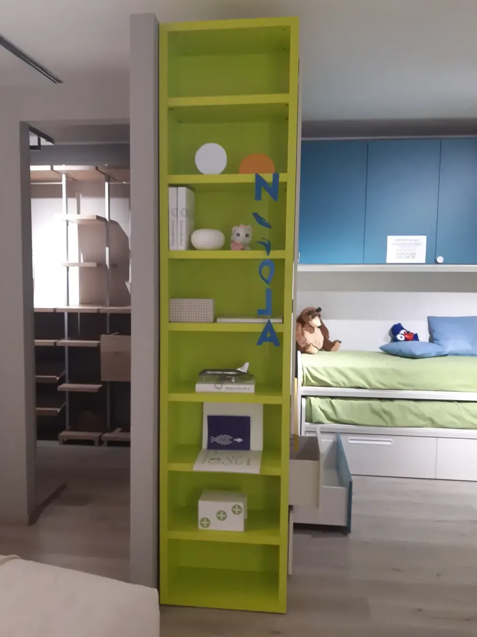 Camera a ponte angolare: la composizione prevede un ampio armadio con ante a terra ed a ponte; lo scrittoio estraibile; la libreria iniziale con spalle e ripiani a forte spessore, l’elemento angolare con portacuscino a ribalta; una libreria posta sopra il piano estraibile; due letti Arkimede scorrevoli ed indipendenti; letto inferiore con due pratici ed ampi cassettoni estraibili