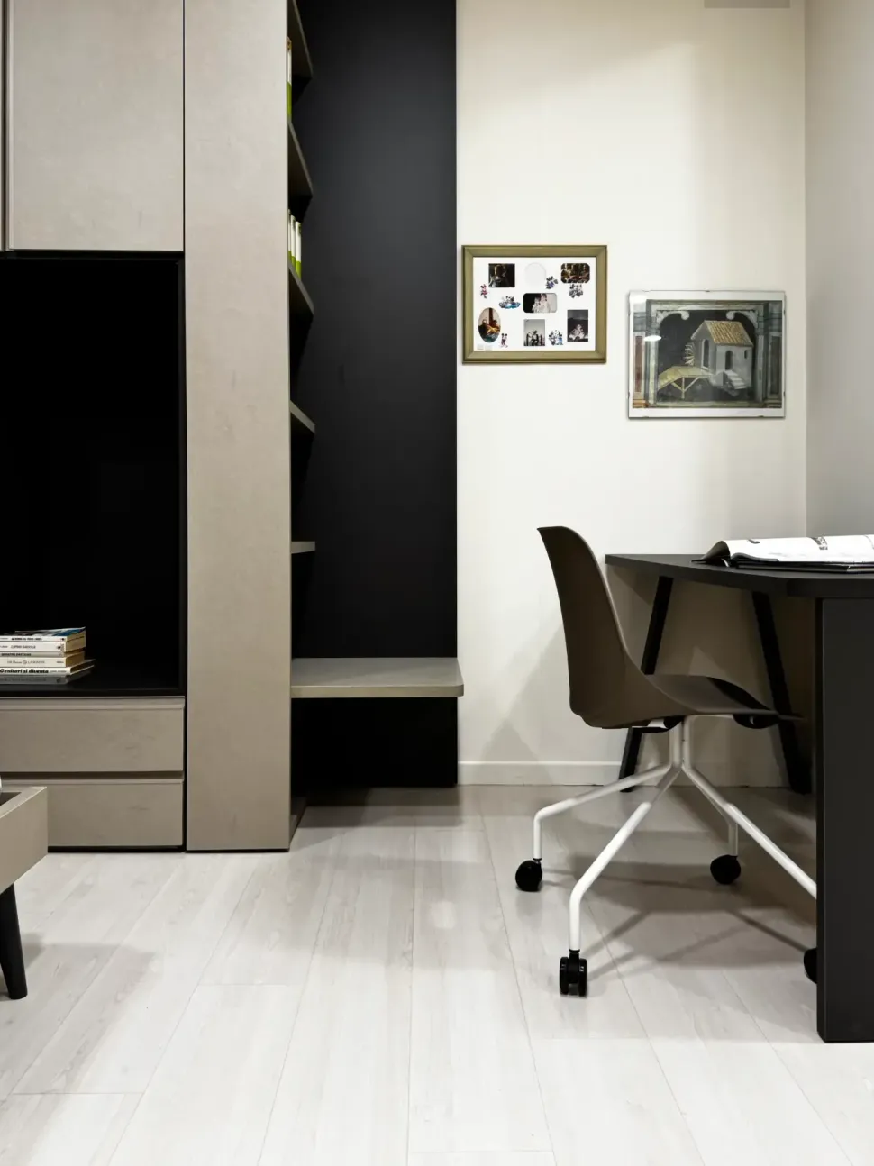 La Cameretta Evo2 di Mistral è adatta a tutte le età e presenta soluzioni versatili e ideali ad ogni metratura. Grazie alla varietà di componenti può essere modificate nel tempo e riadattata alle necessità sia di utilizzo che di spazio. Si compone di un comodo letto da una piazza e mezza modello Strike con giroletto dritto e piede conico in finitura lavagna, un comodino, casellari Kios in finitura Lavagna con ripiani e schiena in finitura Dekor Avana. Un armadio battente con vano a giorno, 2 cassetti con gola e libreria terminale Free che arricchisce l angolo studio in cui si aggiunge lo scrittoio T51 in finitura lavagna e una seduta con ruote piroettanti.